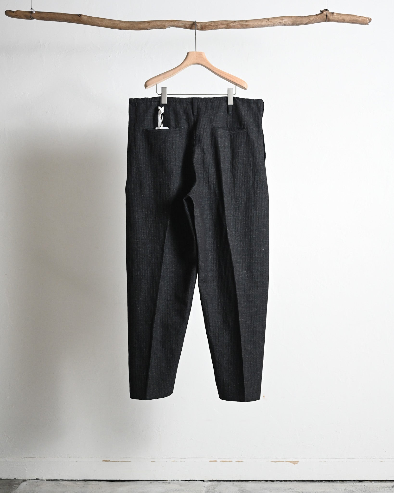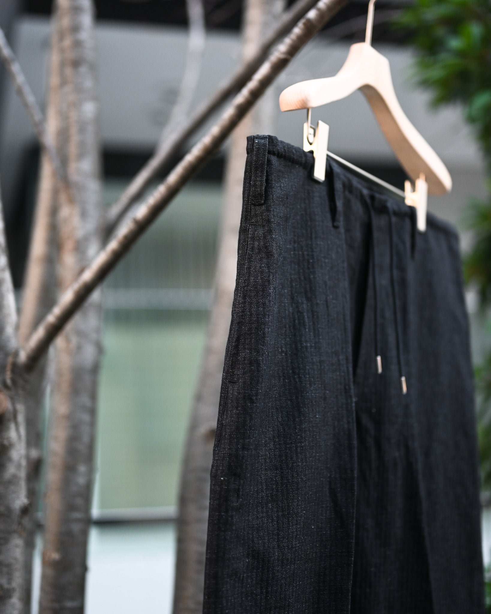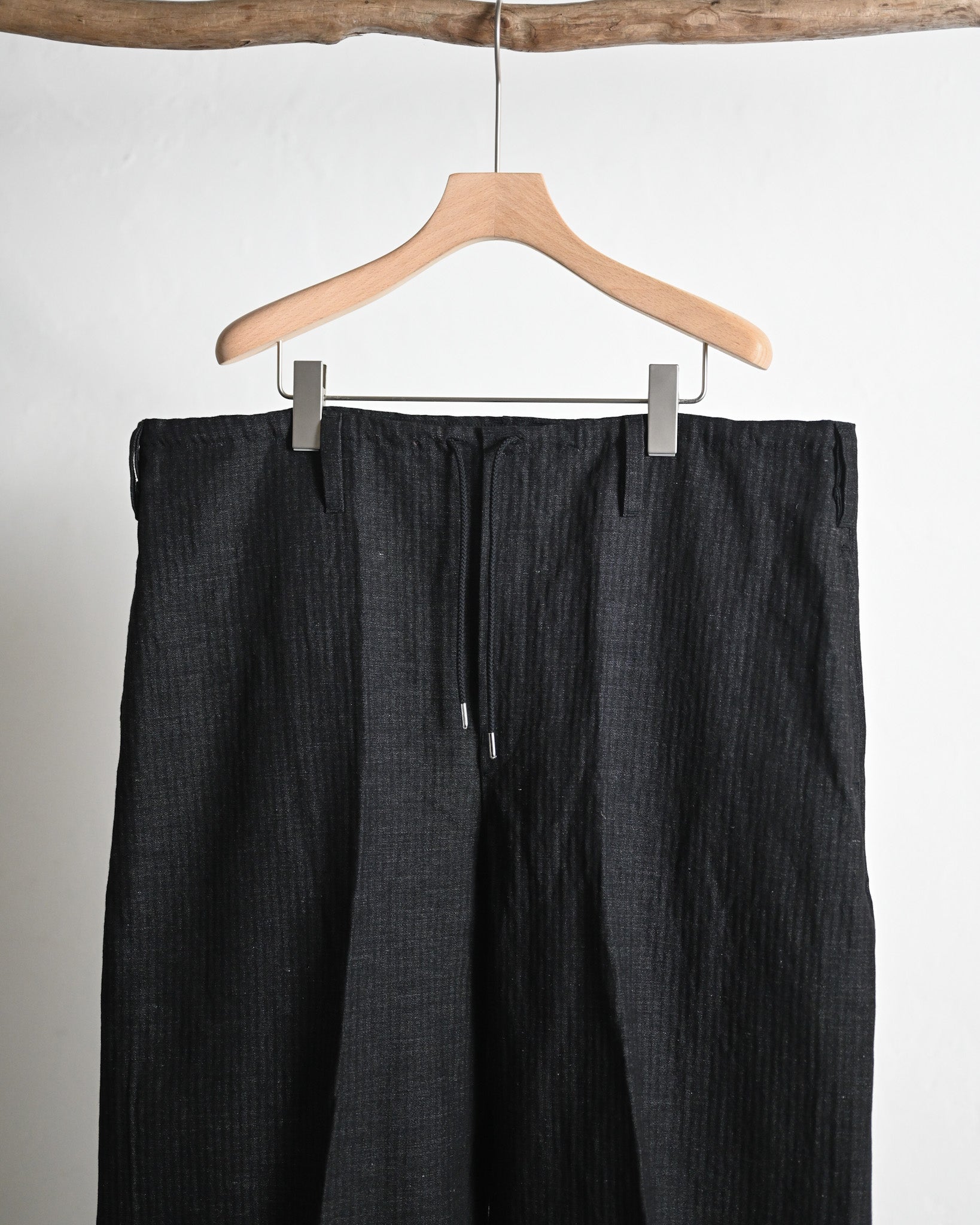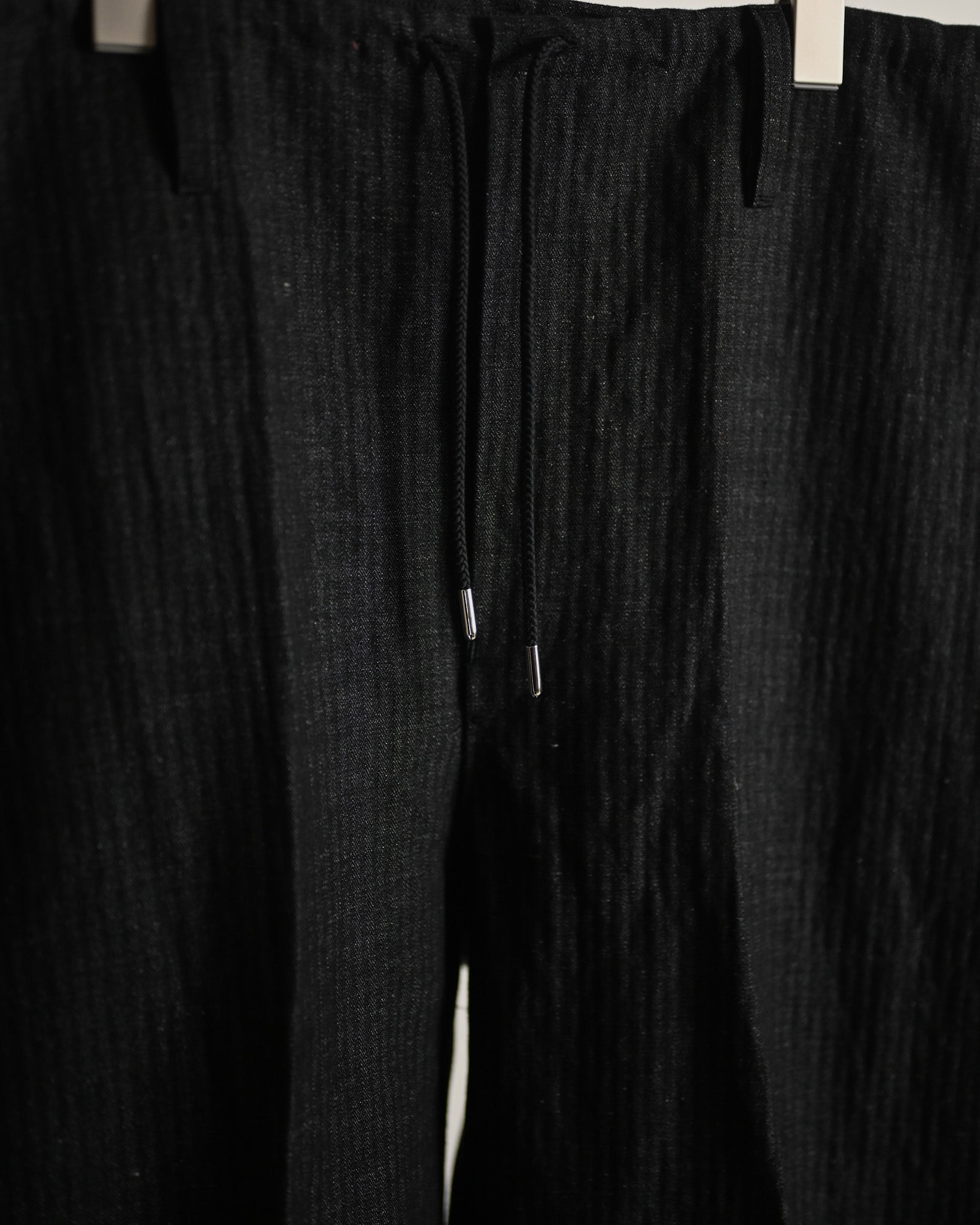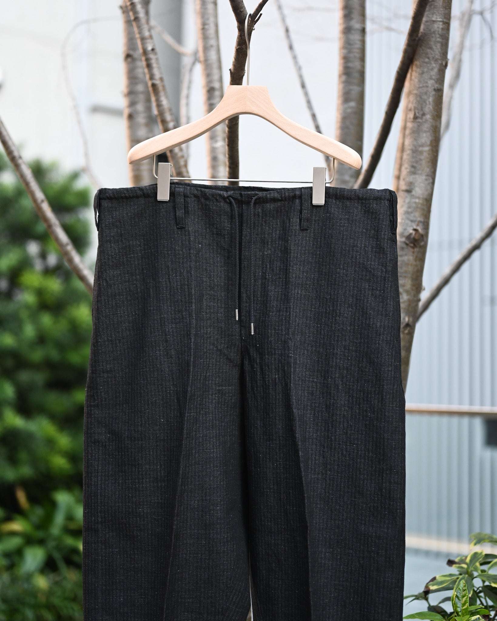 ウエストを大きく設定し、ドローコードやベルトで絞った腰元から裾にかけて生まれる立体感を強調させたデザイン。