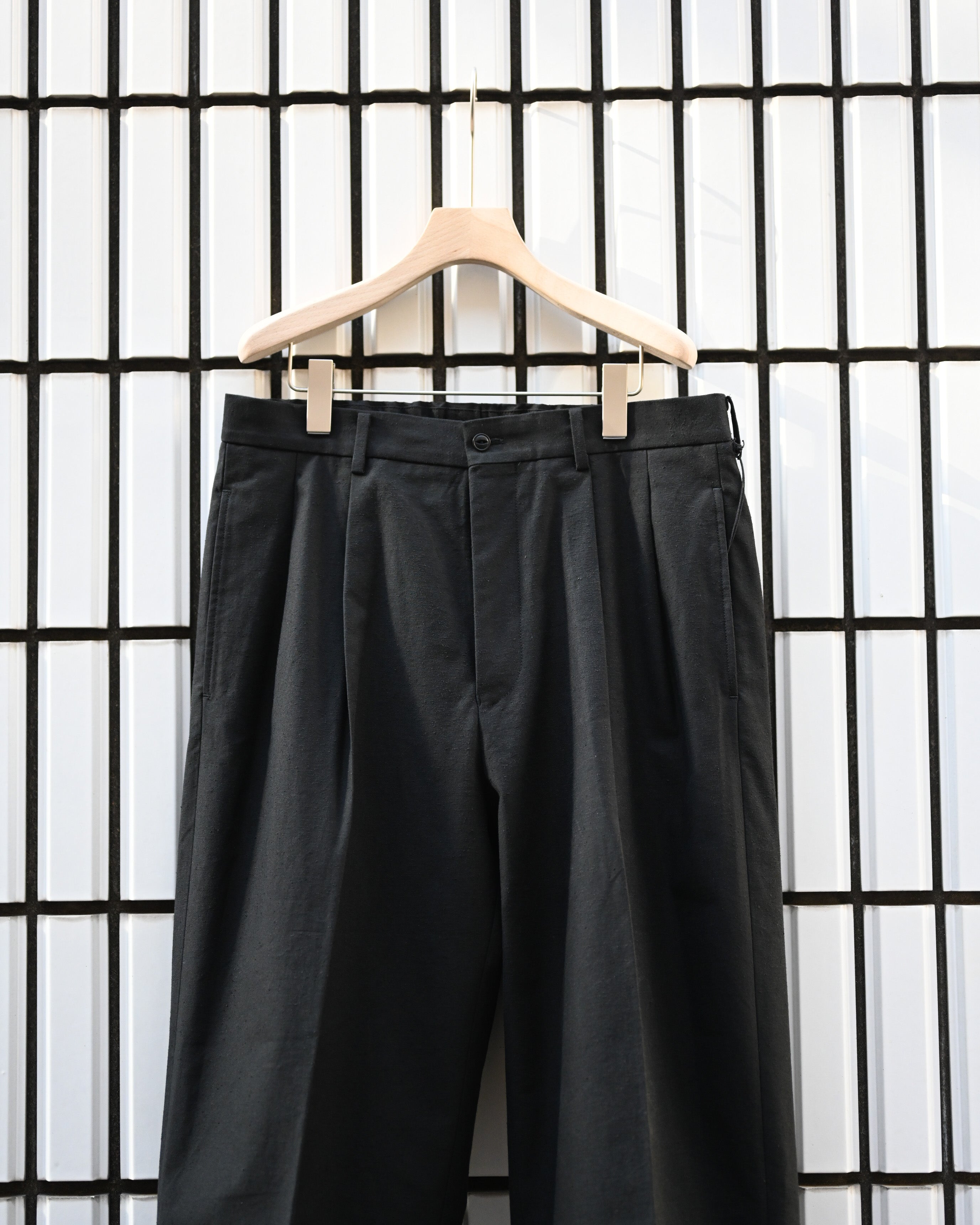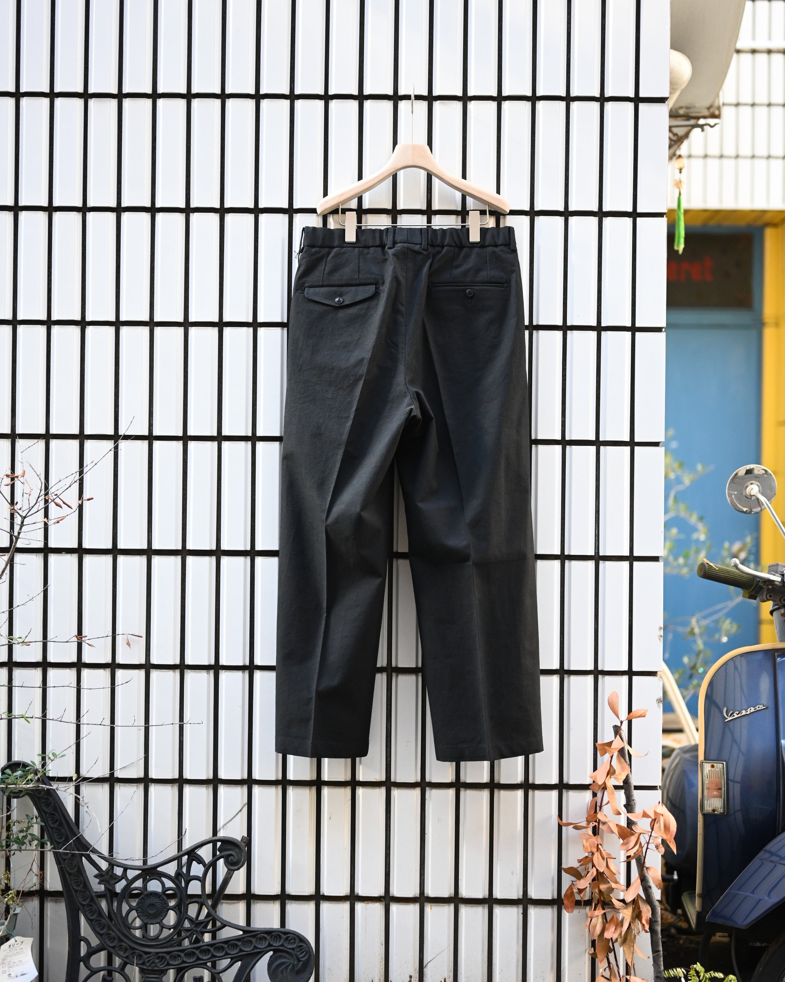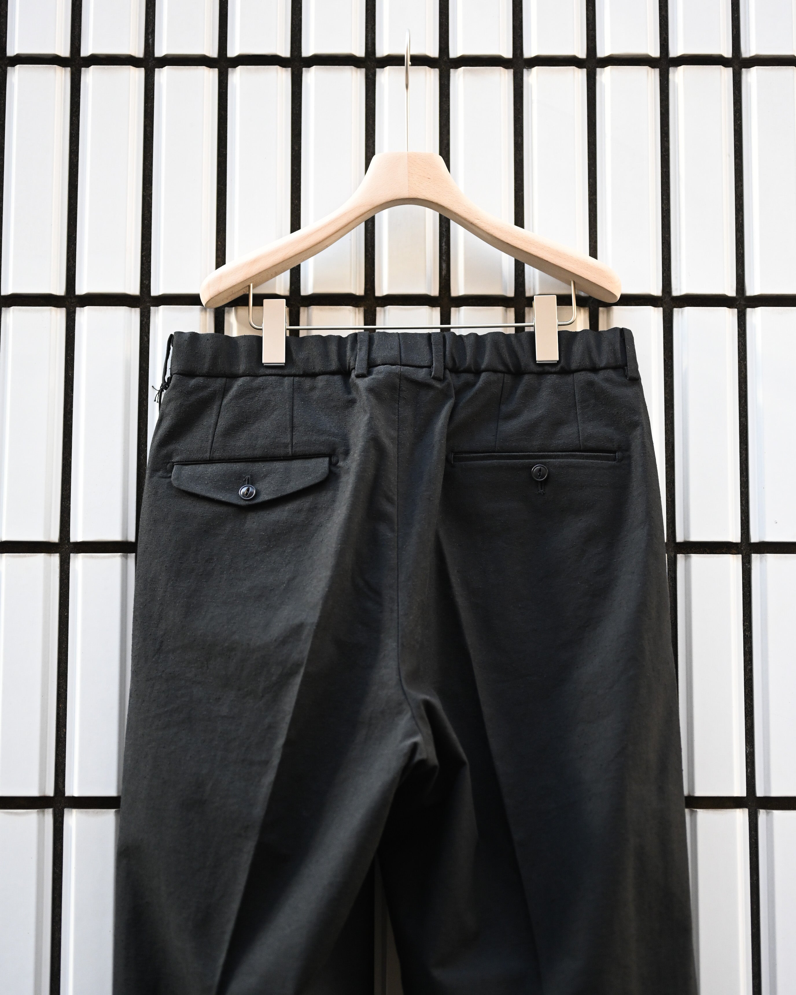 遠州地方の機屋にて製作したオリジナル生地を用いたトラウザー。