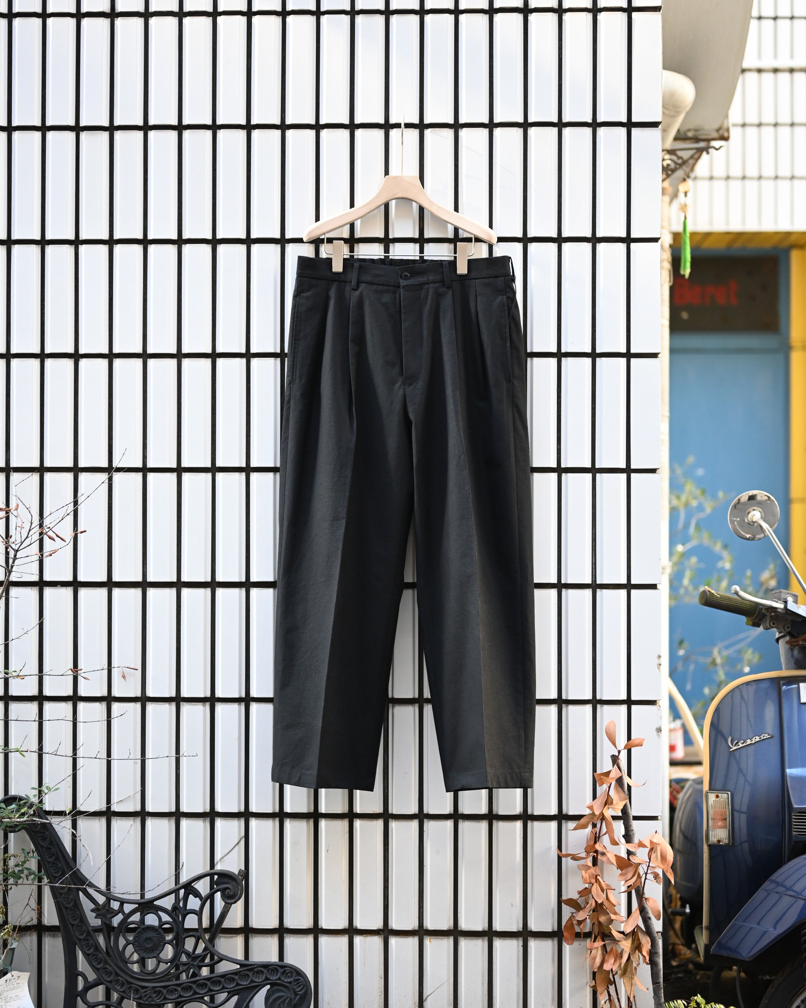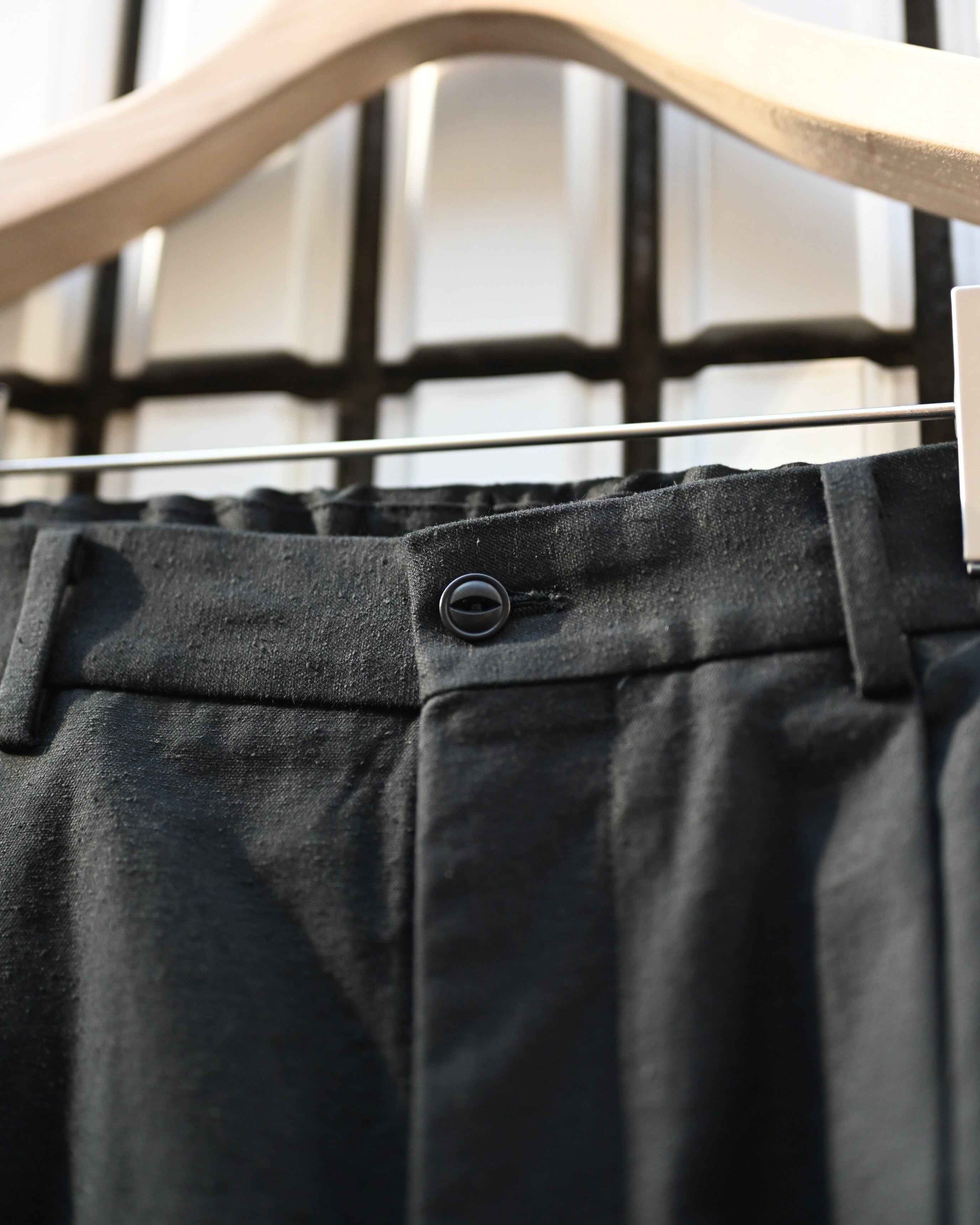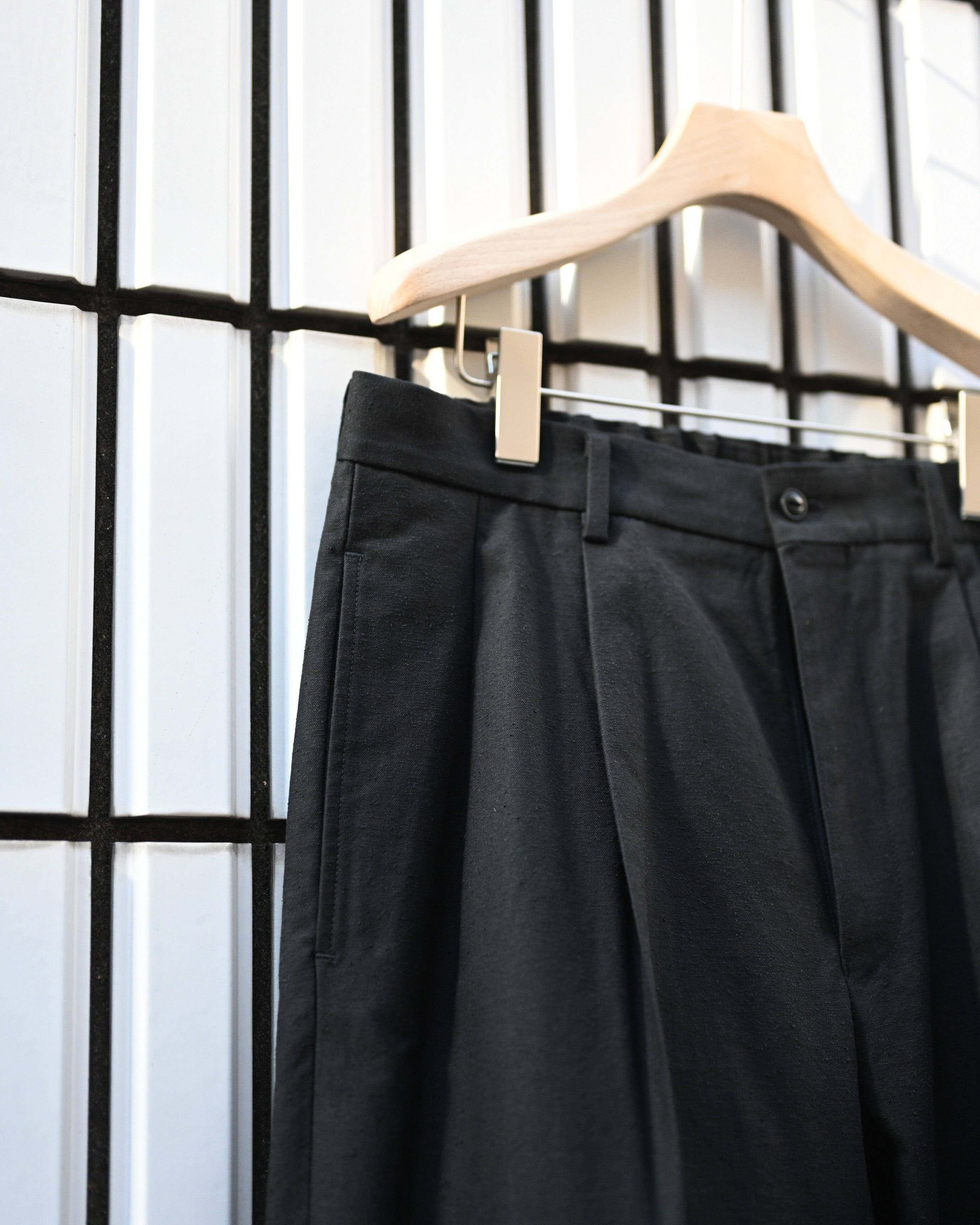 遠州地方の機屋にて製作したオリジナル生地を用いたトラウザー。