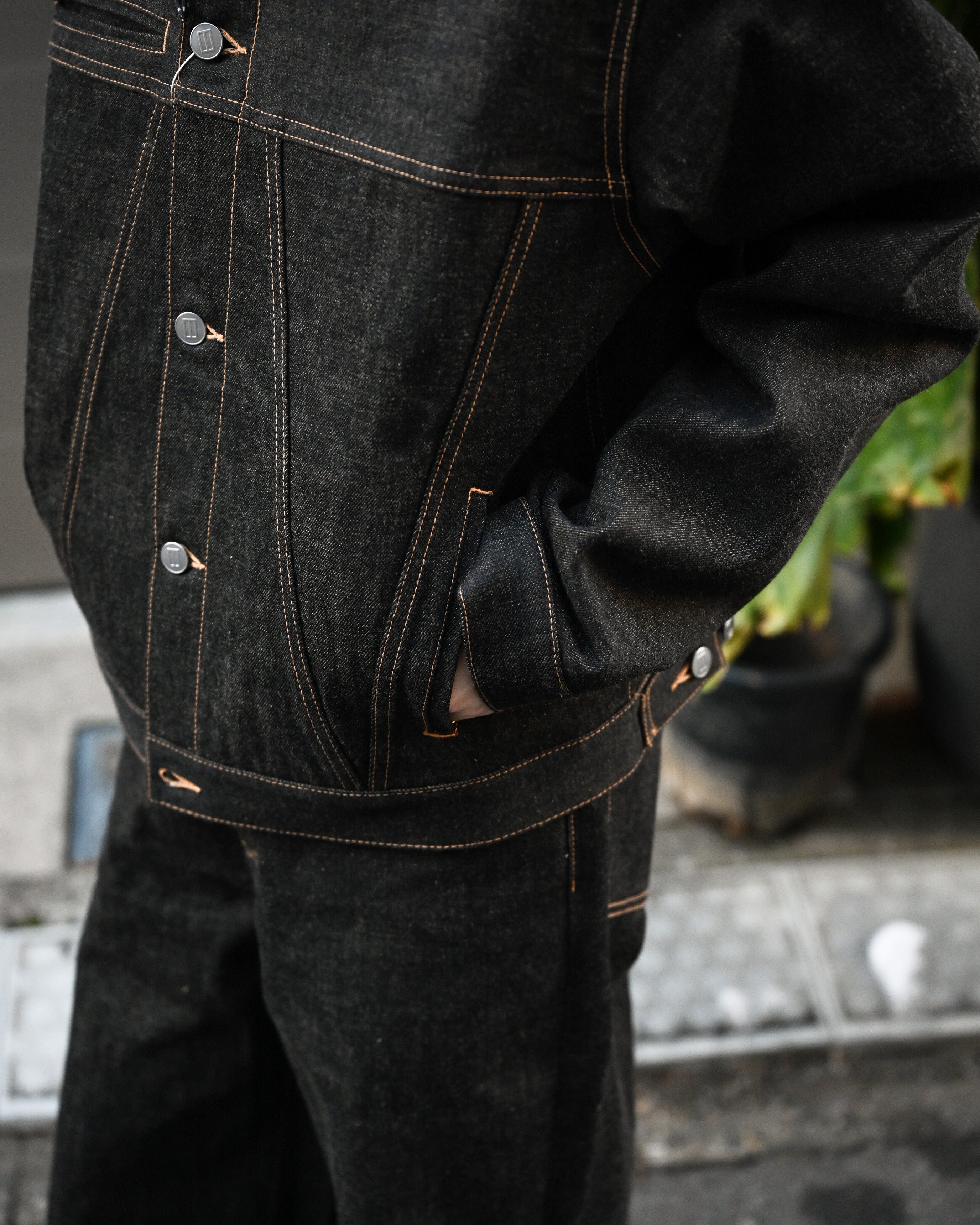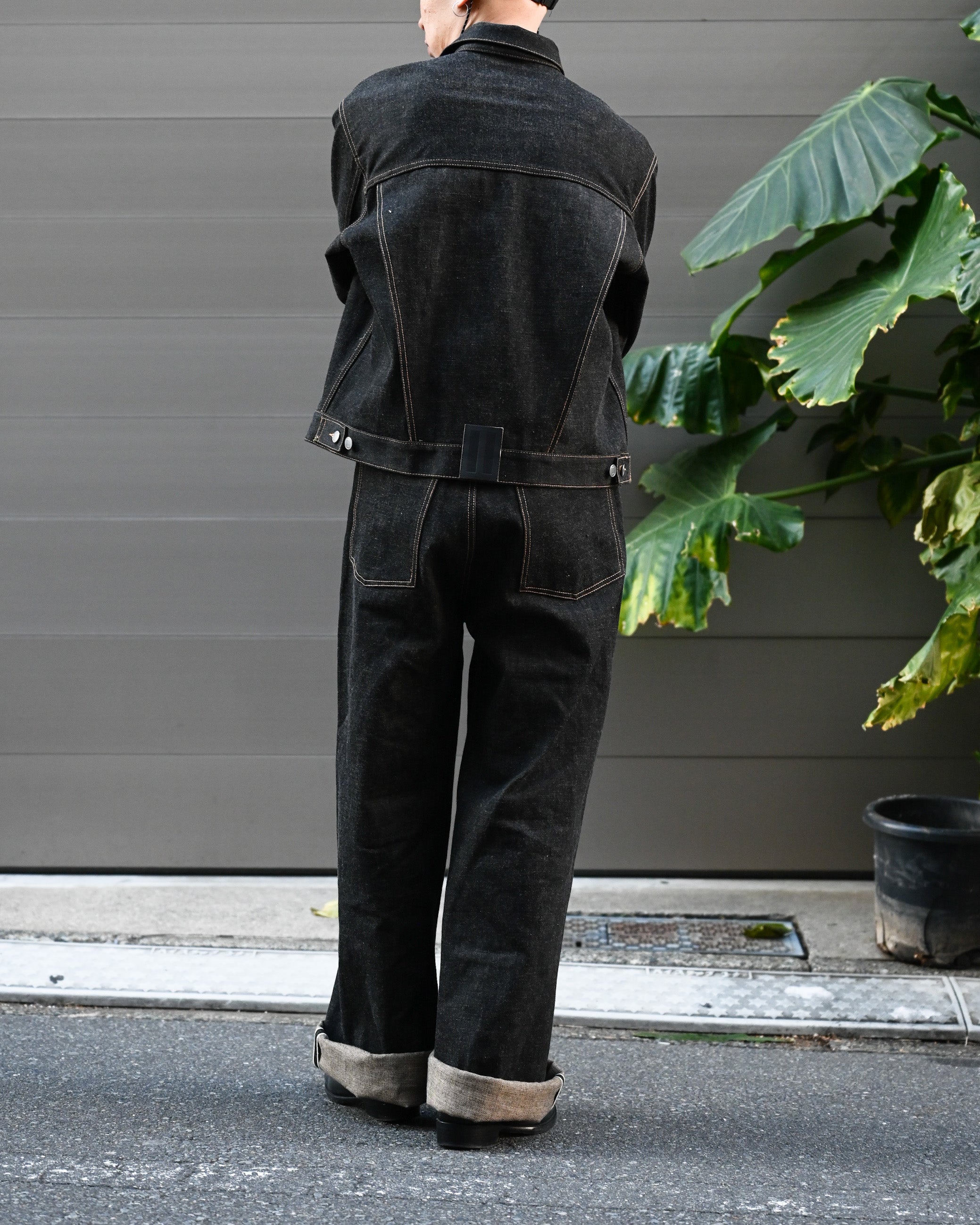 同ブランドから展開される coffee black denim trousers とのセットアップもお勧めです。