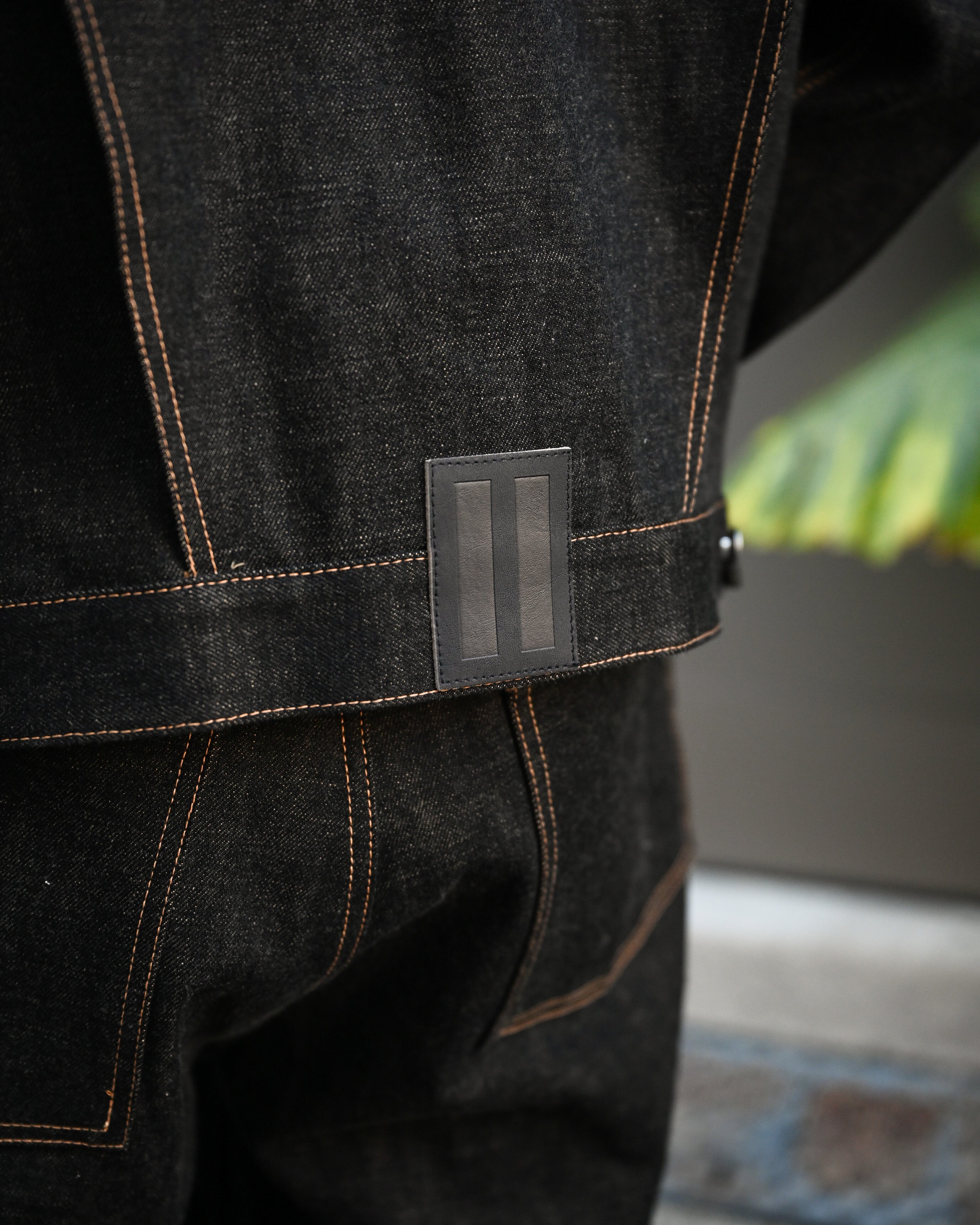 素材には硫化染料で染められた黒い経糸と茶綿の緯糸を旧式織機で時間をかけて丁寧に織り上げられた、ブランドオリジナルのセルビッチデニムを使用。